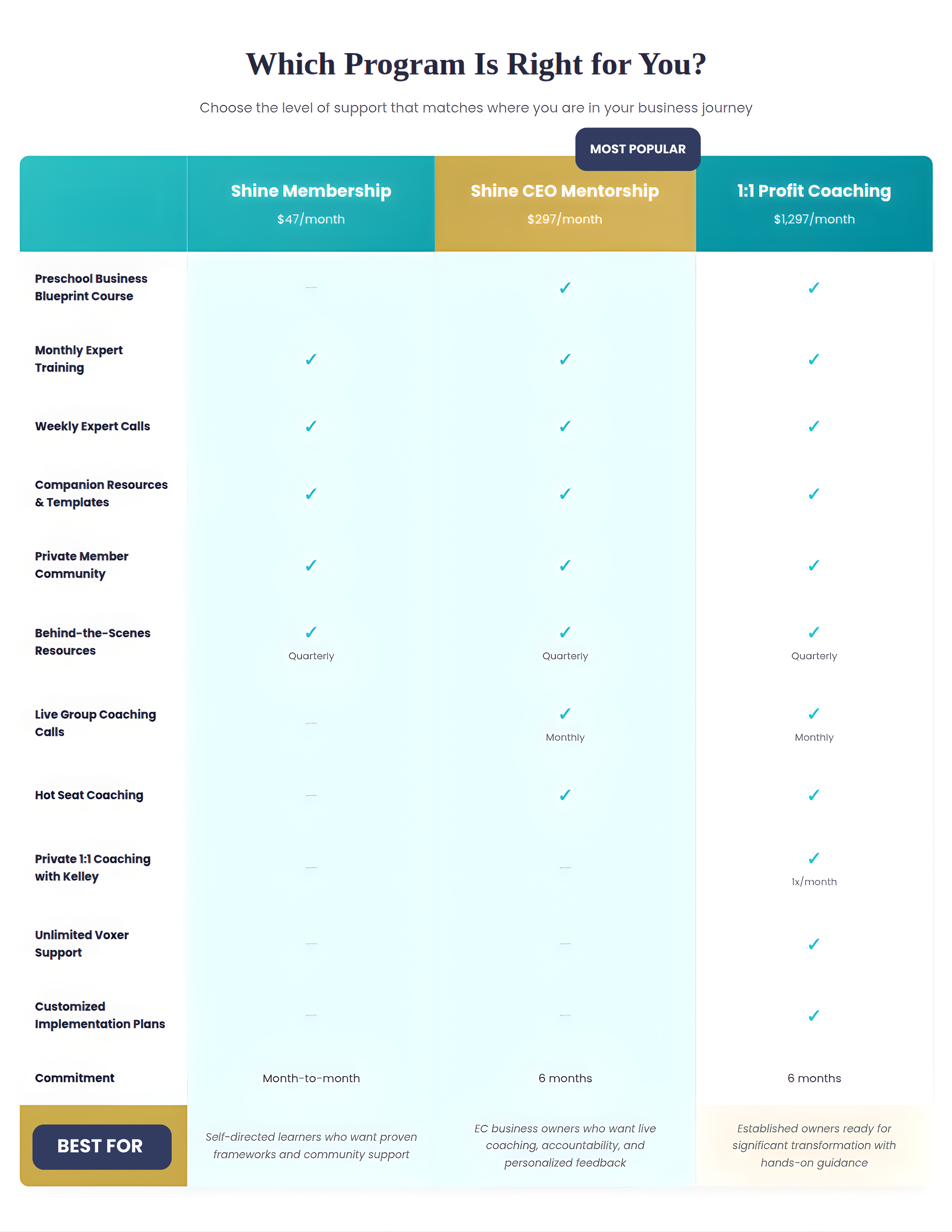 Explore Shine Membership, CEO Mentorship, or Profit Coaching to find the right fit for where you are now and what you need to achieve your goals.